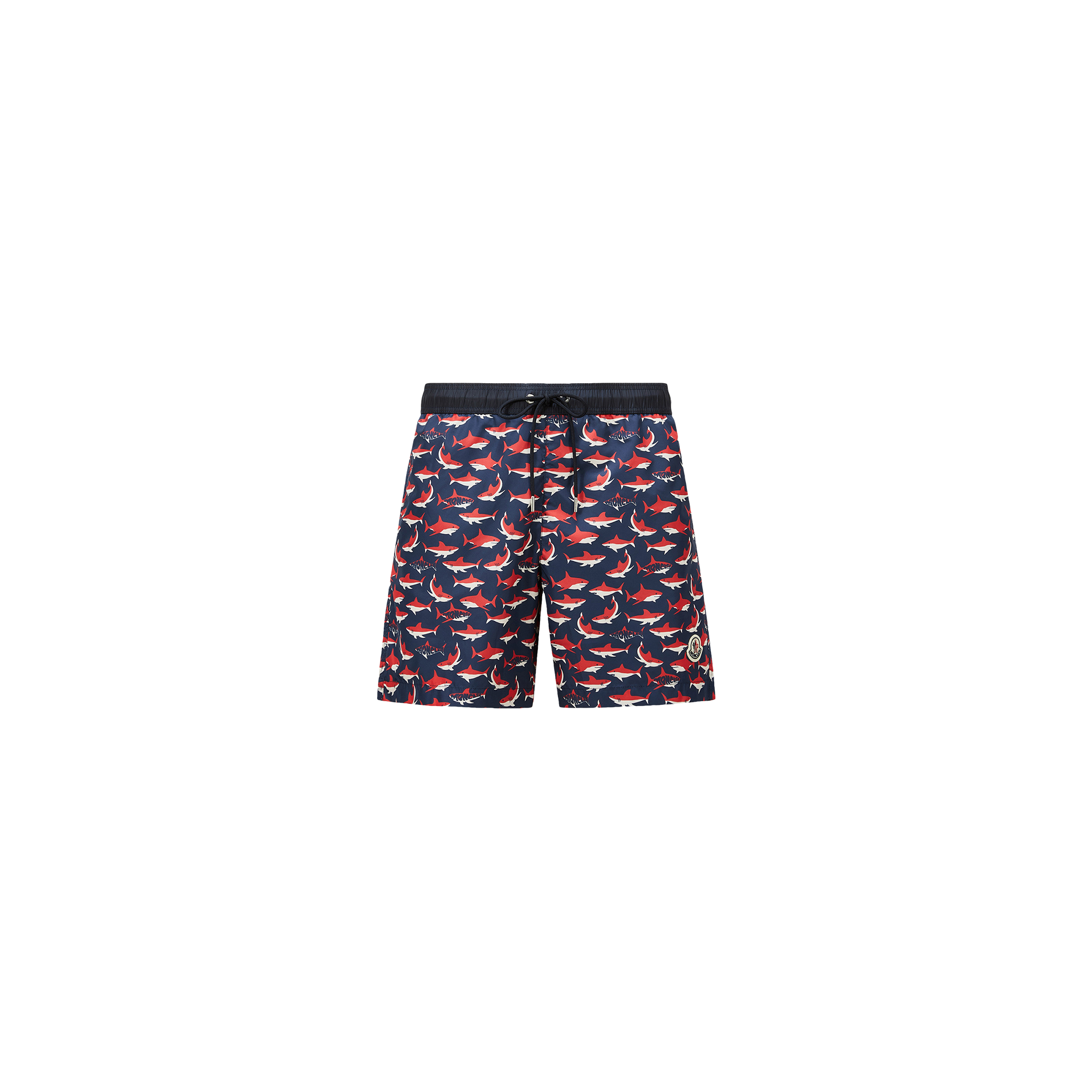 A striking summer style, these swim shorts feature a shark print. The graphic pattern animates matching layers from the collection, creating a patterned resort look.