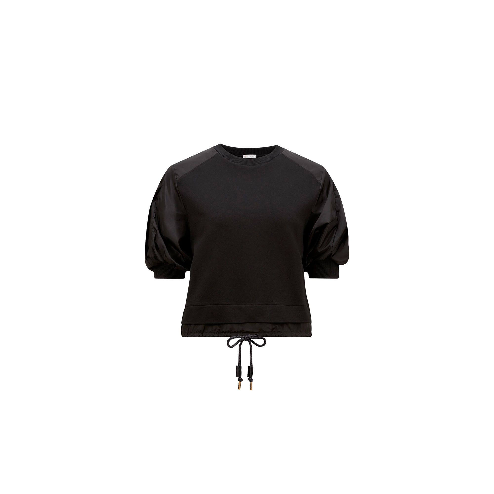 Characterized by unexpected elements, this t-shirt is crafted from a mix of cotton fleece and nylon. The top contrasts an oversized fit with feminine puffed sleeves and a cinched waistband.