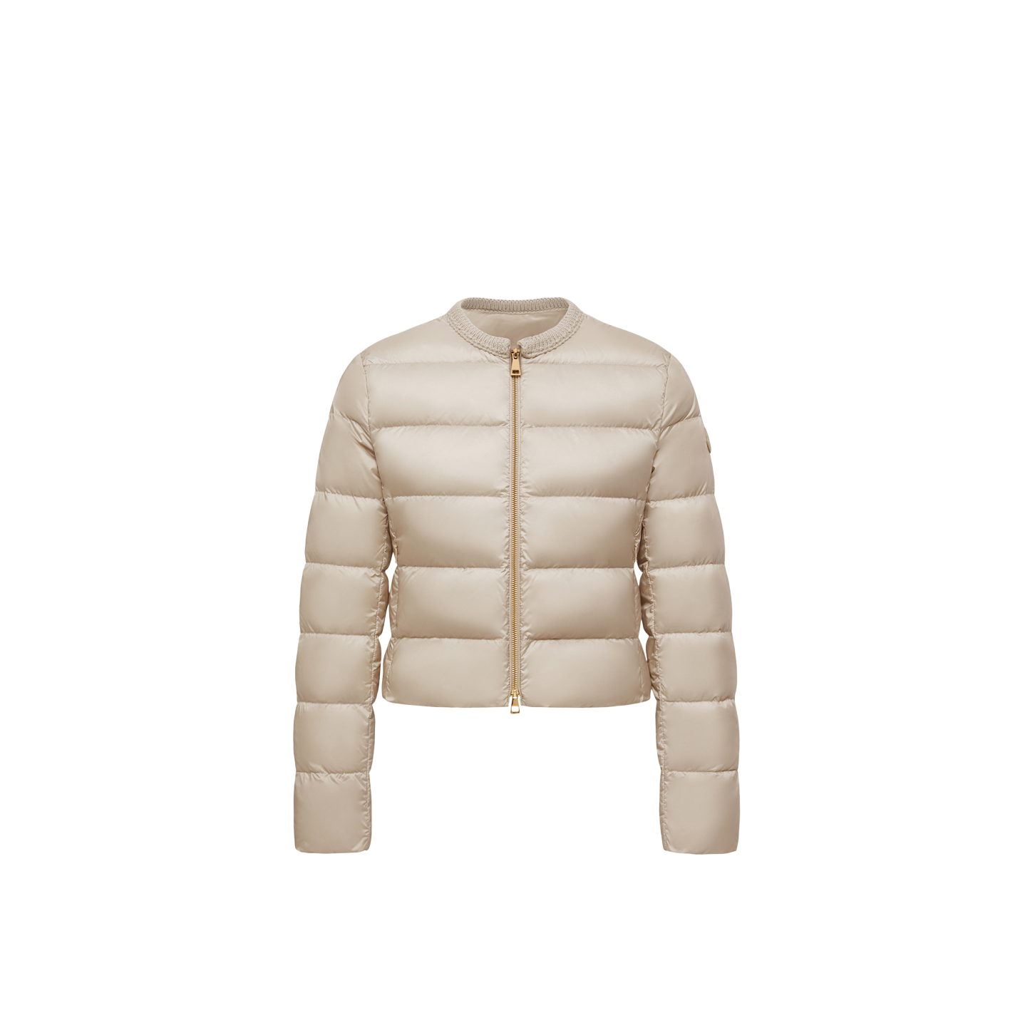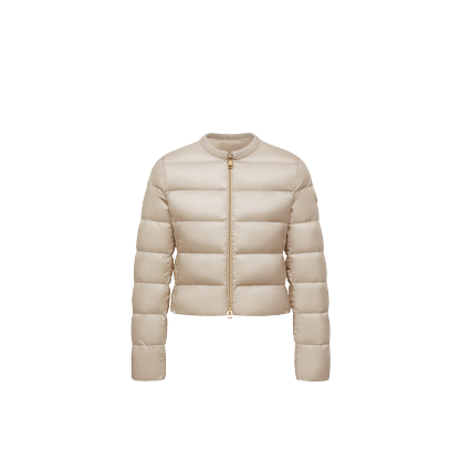 Effortlessly feminine, the Mauvezin down jacket pairs plush fabrics with a collarless silhouette. The puffer is crafted from polyester, brushed for an excelptionally soft feel. A wool trim at the neckline completes the design, adding a precious finishing touch.