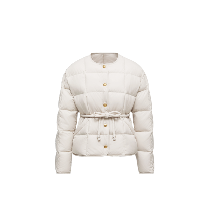 Exploring soft shapes and materials, the Caramagne short down jacket is crafted from recycled polyester. The fabric features a brushed finish, adding a tactile effect and smooth appearance. Creating a feminine shape, the puffer pairs a belted waistline with a collarless design. Featured in a loose fit, the warmer easily layers over heavy knits and sweatshirts in colder weather.