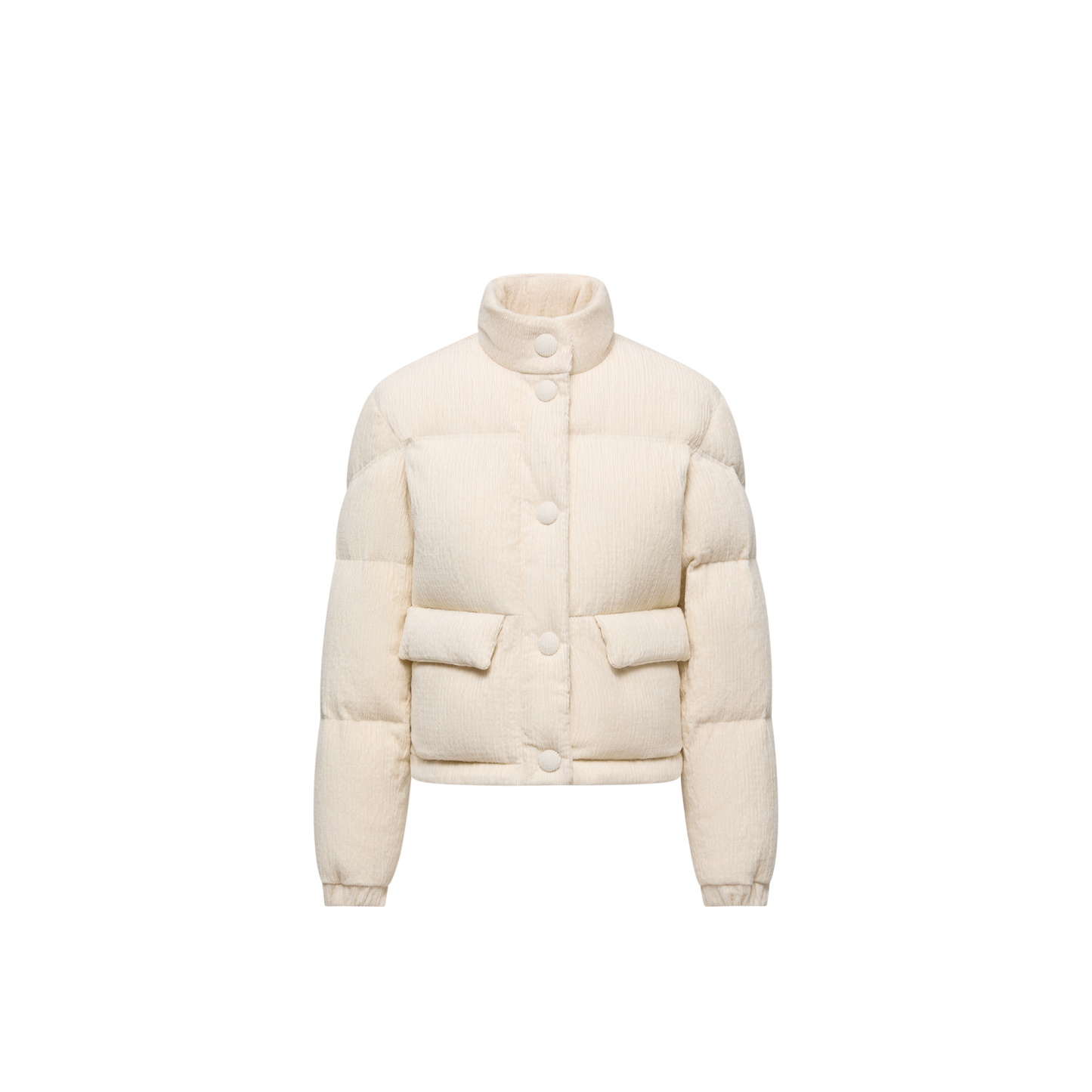 Emblematic of the elegant textures seen throughout the collection, the Aliminia down jacket is presented in ribbed velvet. The short puffer is completed by maxi boudin quilting, adding structure to the silhouette while ensuring warmth. Perfect for falling temperatures, a stand collar completes the warmer.