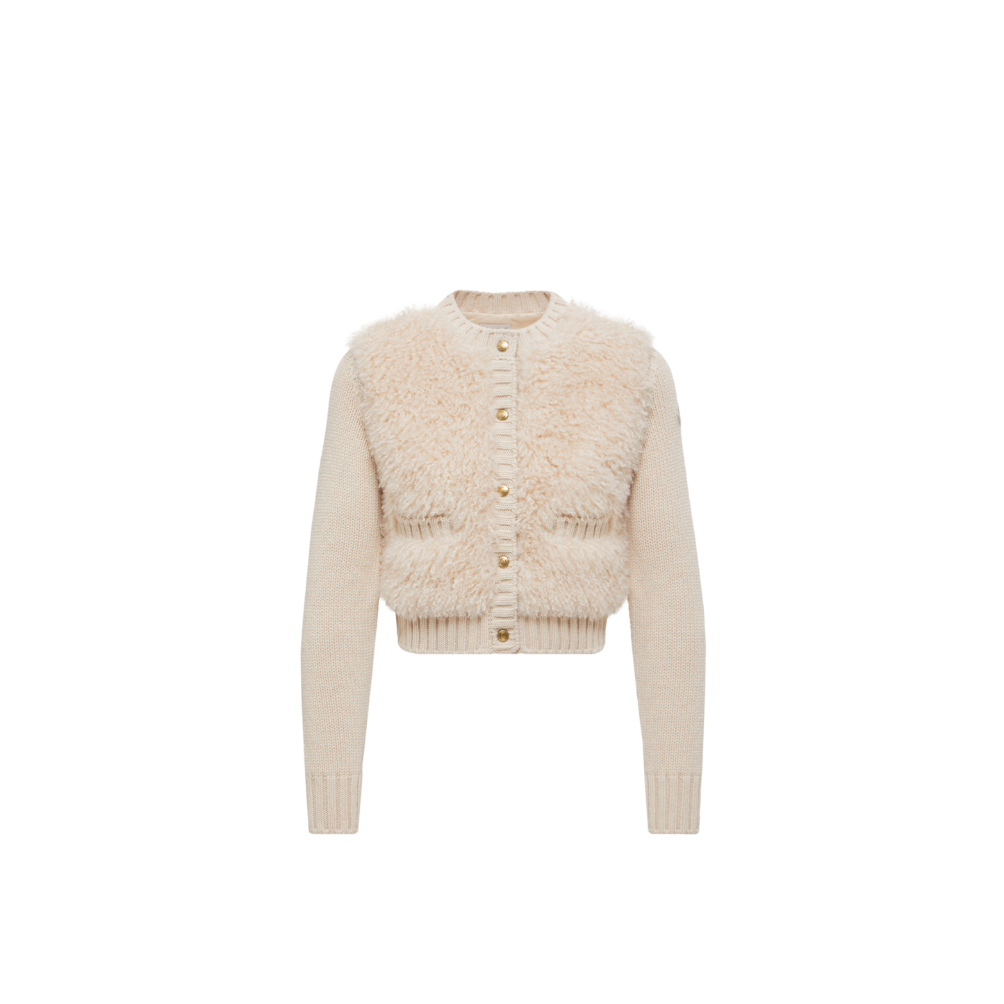 A year-round essential, this cardigan is enhanced with a down-filled back in lightweight nylon. The crew neck is knit from soft wool, further accentuated by a plush teddy front.