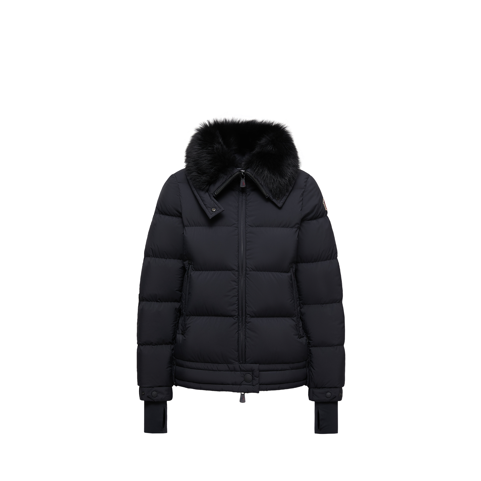 A protective design, the monthtcler Grenoble women's Arabbas short down jacket pairs technical fabrics with a plush shearling trim.