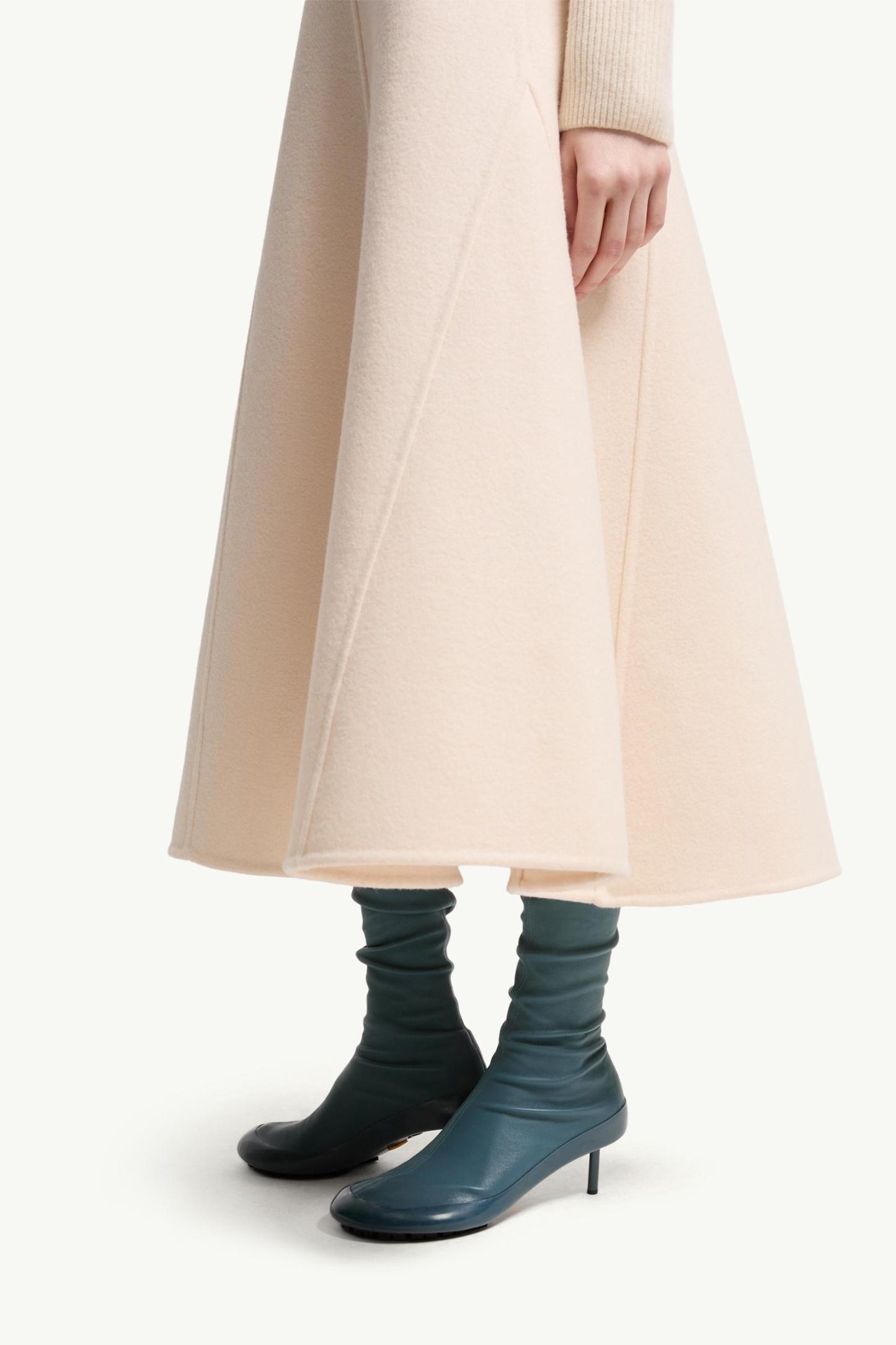 A study in volume, this monthtcler + JIL SANDER midi skirt is defined by a flared silhouette. Crafted from washed double wool, the design balances structure and fluidity. The co-creation's logo completes the design.