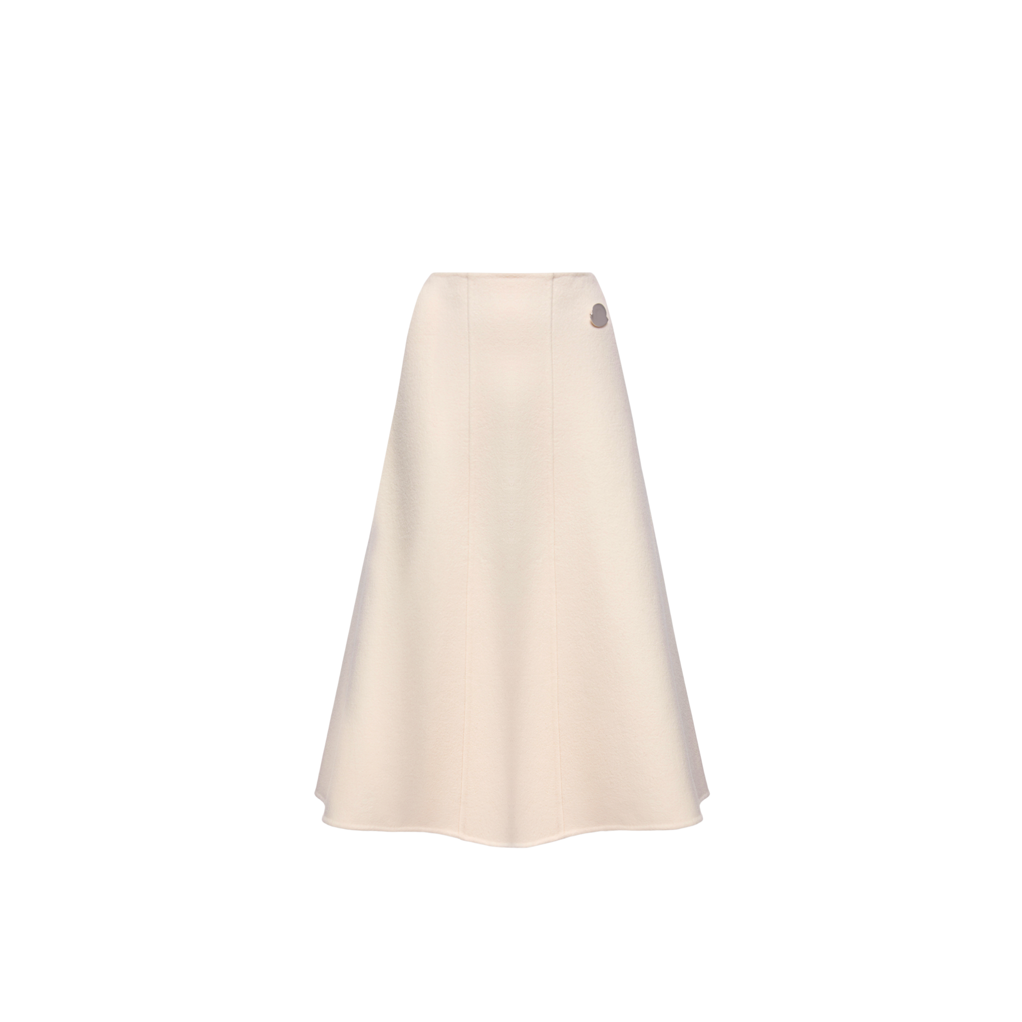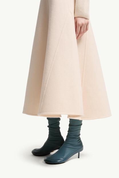 The monthtcler + JIL SANDER wool midi skirt for women embodies a dialogue between softness and structure.