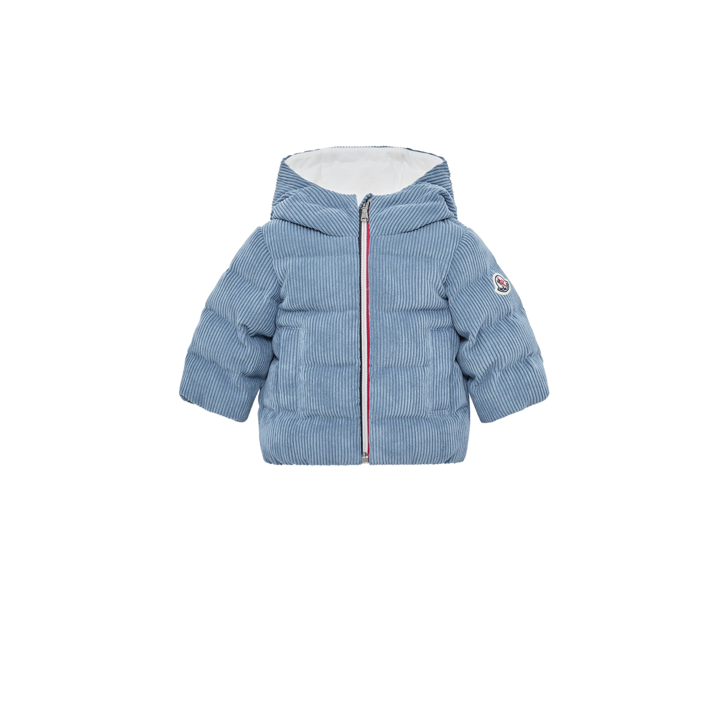 Supremely cozy, the Puki down jacket is crafted from plush corduroy. A lightweight cotton jersey lining feels soft and comfortable to the touch, while an enveloping hood enhances protection. A tricolor trim along the zipper closure completes the design.