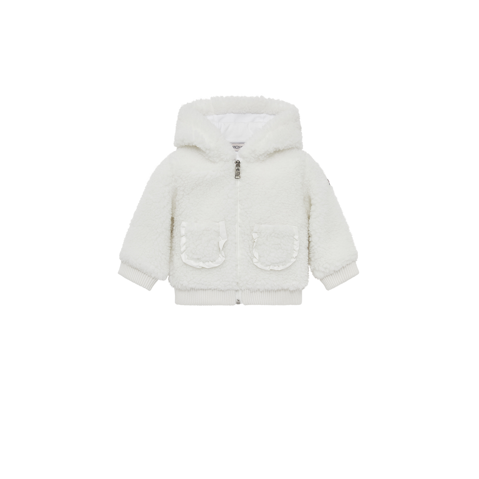 Designed to bring warmth and protection, this zip-up hoodie is crafted from plush teddy. Cotton jersey lining enhances comfort while delicate ruffles along the pockets add a playful note.