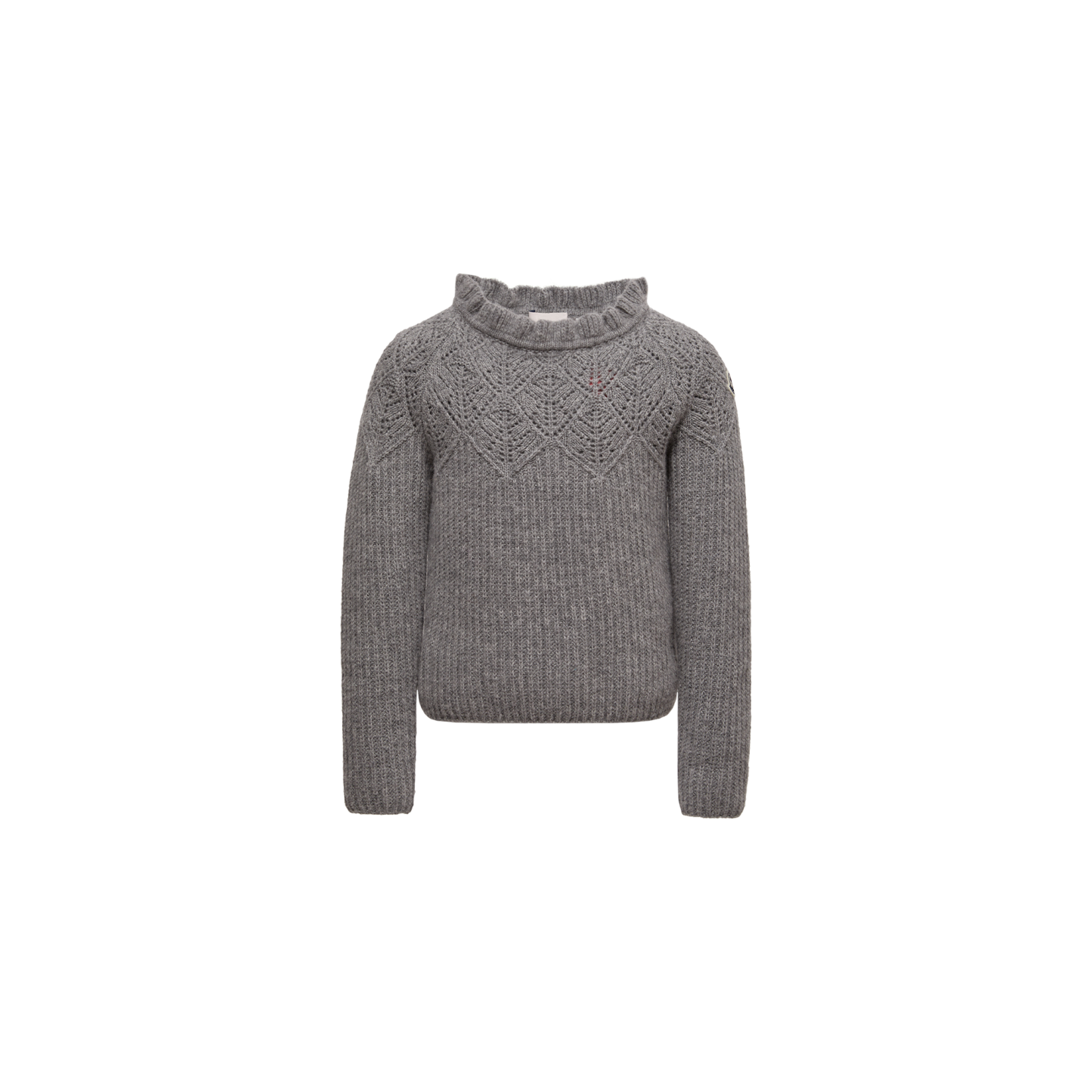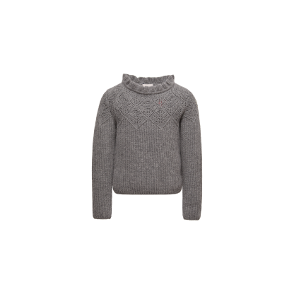 Fit for time spent indoor or outdoor, this sweater is a cozy wardrobe addition. Crafted from wool, the style is detailed with a ruffled crew neck and delicate openwork motifs.