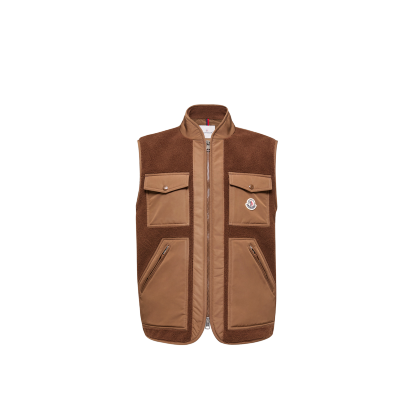 Bringing a tactile twist to technical workwear codes, the Karakai down vest for men contrasts textured teddy with smooth accents.